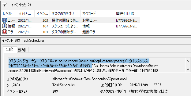 最初にダウンロードしたwin-acme の場所を移動しておかないと、タスクスケジューラに実行ファイルの位置を登録されてしまうため、ファイルが見つからなくなり、実行できなくなります。