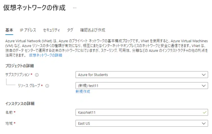 KasoNet11という仮想ネットワークを作成します。仮想ホストと、PostgreSQLデータベースをネットワーク上で接続できるようにするためには、まずは仮想ネットワークから作成しておく事をお勧めします。