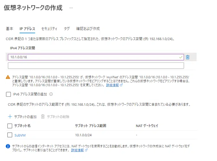 ネットワークアドレス空間は: 10.1.0.0/16で作成