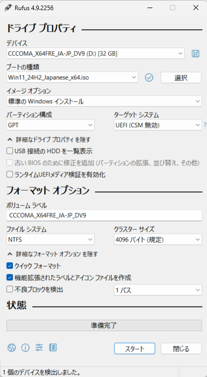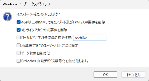 Rufus の標準機能で、Win11要件を回避するインストーラを作成できちゃいます。