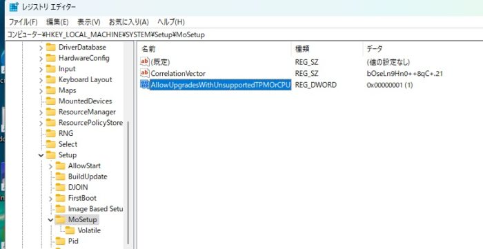 名前: AllowUpgradesWithUnsupportedTPMOrCPU(DWORD 32ビット値)