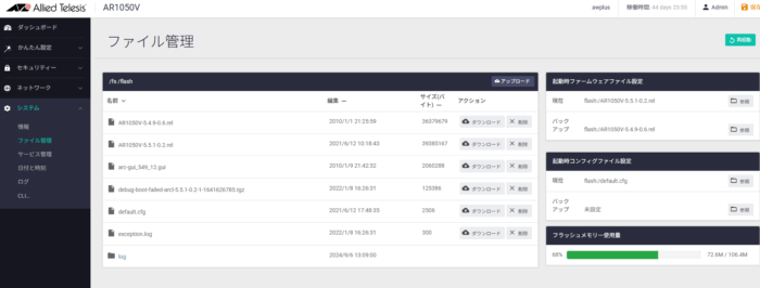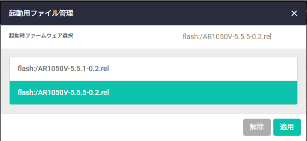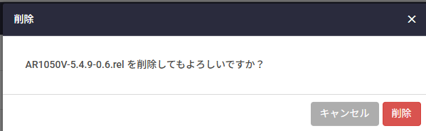 古いファームウェア AR1050V-5.4.9-0.6.relの削除ボタンを押す