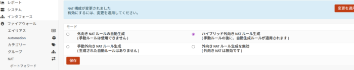 - 画面上部の「モード」にて、「ハイブリッド Outbound NAT ルール生成」 を選択します。