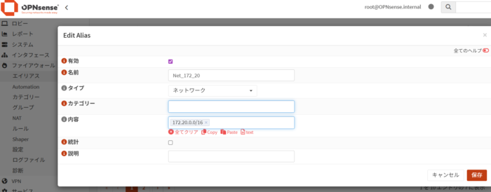 最近の Opnsense のバージョンでは、NAT 設定画面で IP アドレス範囲を直接入力しようとするとうまくいかないことがあります。 そのため、先に「エイリアス(名前)」として登録しておく方法が推奨されます。管理もしやすくなります。