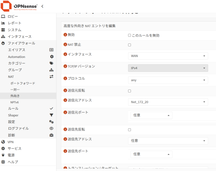 - 「自動生成」のままではダメ: Opnsense は静的ルートを書いただけでは、そのルートを NAT 対象にしてくれません。必ずこの Outbound NAT 設定が必要です。