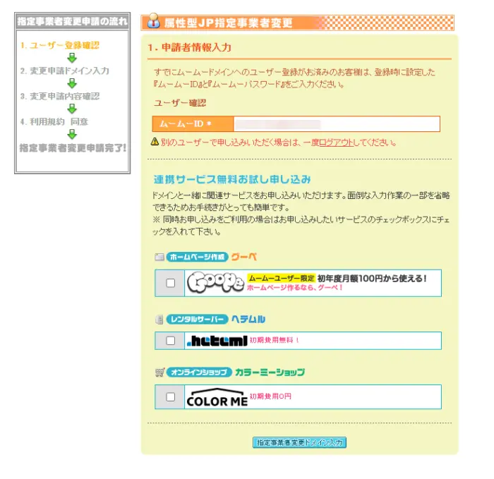 ムームードメインへ移行先指定事業者への指定事業者変更申請を行います。