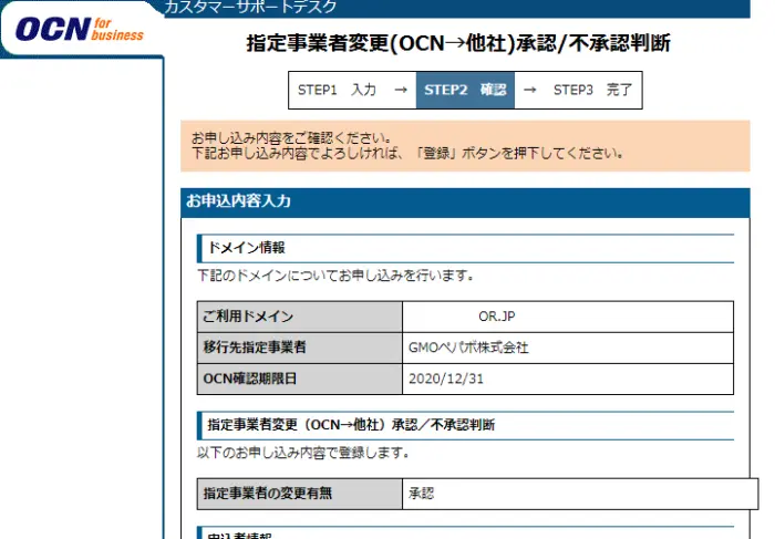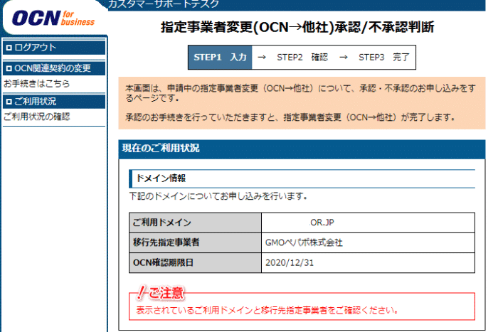 今回はOCNからの移管です。OCN for Bussinessサイトにログインし、ドメイン各種申請から